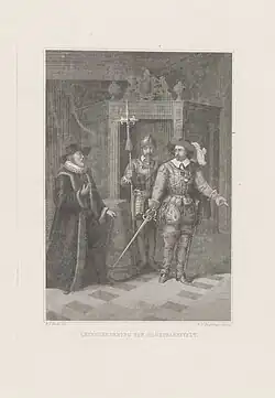 In the trial of Oldenbarnevelt c.s. the court apparently ordered an intendit. This term has puzzled many historians. It was not an "indictment" (as Van den Bergh thinks), nor something comparable to the Conclusion or Opinion given by an Advocate general before the Court of Justice of the European Union (as Uitterhoeve states[19]), nor is it a requisitoir (summing up by the prosecutor) as in modern Dutch criminal cases. The legal concept intendit was found in two contexts in Dutch civil procedural law, firstly in default cases, where the plaintiff was allowed to enter an intendit after the fourth failure of the defendant to appear in court; secondly after the interlocutory order of the court to grant an appointement bij intendit. In both cases it meant a document that contains an exposition of the case of the plaintiff with his supporting evidence. In the second case the order was granted if the defendant denied the facts as presented by the plaintiff, without offering any evidence to support his denial. Alternatives were appointement in feite contrarie (in which case the defendant offered contrary evidence and parties had to prove who was right) and appointement bij memoriën (if the dispute was not about facts, but about points of law).[20] In criminal cases, however, an intendit seems to have been ordered from the prosecutor, again as an exposition of his case, but to act as a guide for further interrogation of witnesses.[21]
