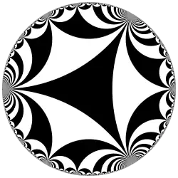 The triangle group is the infinite symmetry group of a tiling of the hyperbolic plane by hyperbolic triangles whose angles add up to a number less than π. All triples not already listed represent tilings of the hyperbolic plane. For example, the triple (2,3,7) produces the (2,3,7) triangle group. There are infinitely many such groups; the tilings associated with some small values: