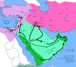The Kingdom of Kinda played a vital role in the military forces of the Jund of Homs and the Jund of Palestine.[53][54] Bin Khadij al-Tujaybi was involved in the campaigns at Jalawla and confronted the Roman forces.[55]