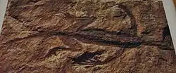 The Tridentinosaurus holotype specimen, MGP-PD 26567, was discovered in 1931 in tuffaceous sandstone layers of the Regnana Formation ('Stramaiolo' (Redebus) locality) in Trentino-Alto Adige, Italy. The specimen appears to consist of a carbonized outline—missing the tip of the tail and most of the skull—of a lizard-like animal surrounding a fragmentary skeleton. Reports of the full body outline as preserved range from 23.5–26.5 centimetres (9.3–10.4 in). The specimen appears to demonstrate an elongated, slender neck and torso. The outline shows that the first through fourth toes get progressively longer, with the fifth toe being notably smaller.[1][2]