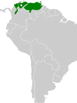 The Trinidad euphonia is found in northern Colombia, northern Venezuela, and Trinidad. A single Tobago record is regarded as a probable escaped cage bird.[14] On Trinidad, it is found primarily in second growth and hill forest near mistletoe and in cultivated areas with large trees, though on the west coast it is also found in mangroves.[6][14] On the mainland, it occurs in the tropical zone at elevations up to 1,100 m (3,600 ft), and is especially common in arid regions.[9] Habitats include dry forest, the edges of moist forest, light woodland, scrub, and cultivated areas. In moister forest, it is replaced by the purple-throated euphonia.[7] There have been several exceptionally high sight-only (i.e. undocumented) records in Venezuela: one at 1,200 m (3,900 ft) and another at 1,450 m (4,760 ft).[15]