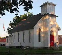 The church's board and batten walls, lancet windows, and bell tower with an open belfry are typical of Carpenter Gothic style architecture.[3] It is no longer in use as a church and is included now on city park property just west of the city hall.