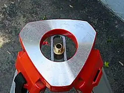 Many modern tripods are constructed of aluminum, though wood is still used for legs. The feet are either aluminum tipped with a steel point or steel. The mounting screw is often brass or brass and plastic. The mounting screw is hollow and has two lateral holes to attach a plumb bob to center the instrument e.g. over a corner or other mark on the ground. After the instrument is centered within a few cm over the mark, the plumb bob is removed and a viewer (using a prism) in the instrument is used to exactly center it.