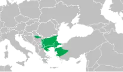 Its distribution ranges from the Southeastern Balkan peninsula (Western North Macedonia, Northwestern Greece, Bulgaria, Eastern Thrace) to Western Anatolia. An isolated population, surrounded by other crested newt species, occurs in Serbia.[3] Genetic data showed that Northern Anatolian populations east of the Bosphorus and Bursa form a separate, but morphologically indistinguishable sibling species, which was described as Anatolian crested newt (T. anatolicus) in 2016.[6]