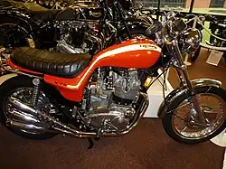 The Triumph X-75 Hurricane was a 'factory special' motorcycle designed by fairing specialist Craig Vetter.[1] The X-75 had swooping glassfibre bodywork, a three US-gallon petrol tank, lowered gearing and a distinctive triple exhaust on the right-hand side. The motorcycle is credited with creating a new class of motorcycle, the cruiser.[2]