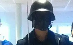 Pettersson entered Kronan at 10:06, wearing black clothing, a cape, a Stahlhelm-style helmet and a paintball mask. At first, eyewitnesses believed Pettersson's presence to be a Halloween prank.[3] Media outlets compared Pettersson's appearance to the appearance of Darth Vader, a fictional character in the film franchise Star Wars.[4]