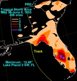 Tropical Storm Alice was the first tropical cyclone in the Atlantic Ocean to receive a female name. It was a rare off-season tropical cyclone that hit Central America, Cuba, and Florida in late May to early June 1953. Alice formed on May 25 in the western Caribbean, and executed a large loop over Central America. It passed over western Cuba, causing heavy rainfall and possibly several casualties from drowning. It then executed another loop in the Gulf of Mexico, reached a peak intensity of 70 mph (110 km/h), and weakened before hitting the Florida panhandle on June 6. Although heavy rainfall occurred in Florida, there was little damage.