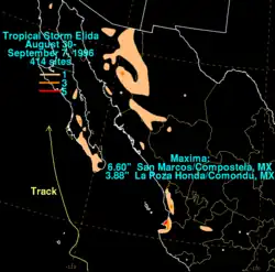 The storm was forecast slightly better than the long term averages for the eastern North Pacific.[1] Elida posed enough of a threat to the Baja California Peninsula to require a tropical storm warning for the Baja California Peninsula south of Cabo San Lázaro on September 3. The warning was lifted on September 5 after the threat ended.[1] Moderate to heavy rains fell in association with the tropical cyclone across southwest Mexico and the Baja California peninsula, with the maxima falling at San Marcos/Compostela in southwest mainland Mexico, which measured 6.60 in (168 mm), and a maximum for Baja California of 3.88 in (99 mm) at La Poza Honda/Comondu.[1] While passing offshore, the tropical storm killed six people and affected 1,200 others,[2] but the damages were minimal.[3]