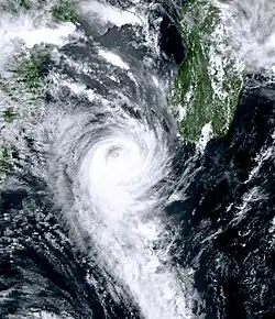 On May 13, a near-equatorial trough developed. The poorly organized system slowly tracked towards the north-northwest. The following day, deep convection consolidated around the center of circulation and the Joint Typhoon Warning Center (JTWC) classified the system as Tropical Cyclone 01B. Favorable upper-level conditions and good outflow allowed the storm to intensify. Shortly after, the cyclone attained tropical storm-force winds and turned towards the northeast. While gradually increasing in forward motion, the storm continued to strengthen. On May 17, the cyclone attained winds of 120 km/h (75 km/h), equivalent to a Category 1 hurricane on the Saffir–Simpson scale. By May 18 an eye developed and the storm reached its peak intensity with winds of 215 km/h (135 mph) before making landfall near Chittagong. After landfall, the storm rapidly tracked northeastward inland and dissipated early on May 20.[21] It caused significant damage and 67 fatalities.[22] On September 19, a tropical depression formed from an area of disturbed weather in the western Bay of Bengal. It drifted northwestward towards the Indian coastline, but a mid-latitude trough pulled it northeastward, The depression strengthened to a tropical storm on the 24th, and it reached cyclone strength while paralleling the Indian coastline on 26th. It made landfall in Bangladesh on the 27th, and dissipated shortly thereafter. Tropical Cyclone 2B was responsible for 51 fatalities and left an additional 137 people missing.[23]