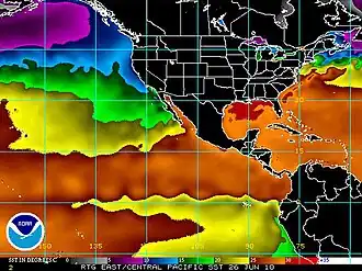 A plot of Pacific sea surface temperatures on June 26, 2010. Tropical instability waves are visible as north–south deflections of the tongue of cold water that extends along the equator. These waves propagate westward with a period of about 30 days.