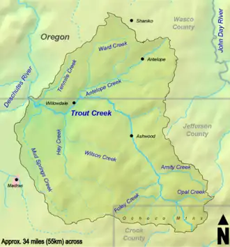 Trout Creek's headwaters are in the western Ochoco Mountains, northeast of Prineville. It flows north, gathering minor tributaries such as Auger Creek and Amity Creek. The creek turns northwest and then west near the ghost town of Ashwood, straddling the Jefferson/Wasco county line. It receives Antelope Creek on the right bank. Highway 97 crosses the creek near Willowdale. Several miles downstream, Trout Creek receives Hay and Mud Springs creeks on the left bank.[5] It then flows into the Deschutes River 87 miles (140 km) above its confluence with the Columbia River.[4]