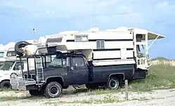 The lines of definition can blur between a truck camper and a recreational vehicle (RV) with some expedition vehicles like the xpcamper[6] or the EarthRoamer. Truck campers are temporarily mounted, while the camper part of a RV are typically not designed to be easily removed from the vehicle it's attached to.