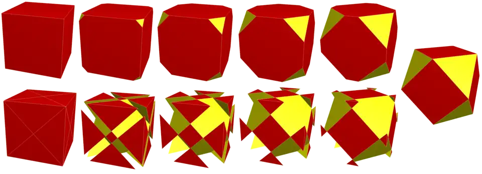 If the self-intersected portions of the octagrams are removed, leaving squares, and truncating the triangles into hexagons, truncated octahedra are produced, and the sequence ends with the central squares being reduced to a point, and creating an octahedron.