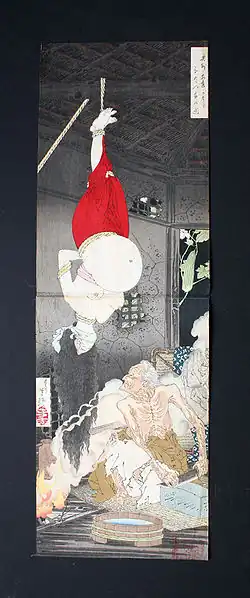 Yoshitoshi's notorious, yet compelling, "Oshu adachigahara hitotsuya no zu" (The Lonely House on Adachi Moor) appeared in 1885. This work depicts the legend of kijo in Kurozuka written in "Shūi Wakashū", which was compiled in the 11th century, and Kurozuka is also performed in noh, kabuki and jōruri.[5] This macabre work is iconic in its own right and influential in the history of modern kinbaku, in that Itoh Seiu was fascinated by Yoshitoshi's accurate depiction of sakasa zuri (upside down suspension).