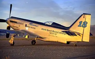 Originally, it was designed as a light-weight racer with a single-staged supercharged Rolls-Royce Merlin. However, as speed increased in the Unlimited Racing Class, a higher powered two-stage supercharged Rolls-Royce Merlin was installed. An attempt was made in August 1989 to break the 3 km (1.9 mi) world speed record at Wendover Utah with a private pilot at the controls. Due to a landing gear collapse the aircraft was unable to beat the existing record.[1]