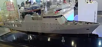 The Damen 1800 OPV contract was awarded to THHE-Destini local company in early 2017. The ship contract is worth RM738.9 million and the construction started in December 2017. The first ship will be completed in mid-2020.[3][4][5][6] The OPV class has a length of 83 metres (272 ft 4 in), a beam of 13.7 metres (44 ft 11 in), and a draught of 3.75 metres (12 ft 4 in). She has a displacement of 1,890 tonnes and a speed of 22 knots (41 km/h; 25 mph). The main armament of the ship are one 1 × 30 mm Aselsan SMASH RWS and light defensive weapons such as 12.7 mm and 7.62 mm machine guns. She also has a complement of 46 crew. To fulfill the patrol duty, she also able to operate one medium-sized helicopter and one unmanned aerial vehicle. All ships will be named after female warriors of Malaysia.[7]