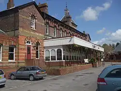 The imposing two-storey main station building was most likely designed by the LBSCR's Chief Engineer, F. Dale Bannister, who was responsible for other stations on the line. Called the "St. Pancras of the Weald"[4] by the Wealden Line Campaign, it was a statement of intent to local inhabitants by the LBSCR which was establishing the limits of its territory.[5] The station is composed of a central block flanked on the western side by a gable-fronted wing, and on the eastern side by a three-storey clocktower with a pyramidal slate roof surrounded by a louvred cupola with a weathervane. The facade of the building is constructed of red brick with ashlar and black brick dressings; on the ground floor level are a series of nine round-arched windows and an arched doorway, with a decorated ashlar impost band connecting the windows. The eaves are serrated with an ashlar cornice. Inside the building was a gas-lit booking hall with four ticket windows and a panelled ceiling supported by arches springing from stone columns.[6]