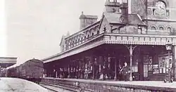 The original two-road locomotive shed (code number 75F) was capable of accommodating six engines and situated to the south of the station. It was opened in 1866[8] and replaced in 1891 by a larger four-road shed located to the north-west of the station.[9] Following bomb damage on 20 November 1940 during the Second World War, the slate roof of the engine shed was replaced with corrugated asbestos.[10] It was closed to steam locos in June 1965 but the tracks were used for storage of engineers rolling stock until the late 1970s when they were removed.