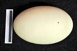 Whistling swans weigh 4.3–9.5 kg (9.5–21 lb) – 7.3 kg (16 lb) on average in males and 6.4 kg (14 lb) in females –, and measure 120–150 cm (47–59 in) in length. Each wing is 50–57 cm (19.7–22.4 in) long; the tarsus measures 9.4–11.4 cm (3.7–4.5 in) in length, and the bill is 9.1–10.7 cm (3.6–4.2 in) long. C. c. columbianus is distinguished from C. c. bewickii by its larger size and the mostly black bill, with just a small and usually hard to see yellow spot of variable size at the base. It is distinguished from the largely allopatric trumpeter swan (C. buccinator) of North America by that species' much larger size and particularly long bill, which is black all over except for the pink mouthline, which is stronger than in the whistling swan.[3][9]