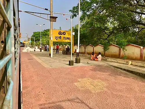 Tuni railway station (station code:TUNI)[1] is an Indian Railways station in Tuni City of kakinada district in the Indian state of Andhra Pradesh. It lies on the Howrah–Chennai main line. It is administered under Vijayawada railway division of South Coast Railway zone (formerly South Central Railway zone).[2] It is one of the 38 stations in the division to be equipped with Automatic Ticket Vending Machines (ATVMs).[3]