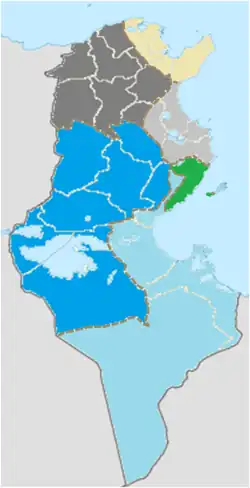 Geographic distribution of Tunisian Arabic as of 1960 (in blue). The fields in dark blue and light blue were respectively the geographic dispositions of Algerian and Libyan Arabic[5][6][7]