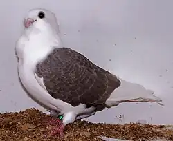 The Turbit is a breed of fancy pigeon developed over many years of selective breeding.[1] Turbits, along with other varieties of domesticated pigeons, are all descendants from the rock pigeon (Columba livia). The breed is known for its peaked crest, short beak and frill of feathers on its breast.[2]