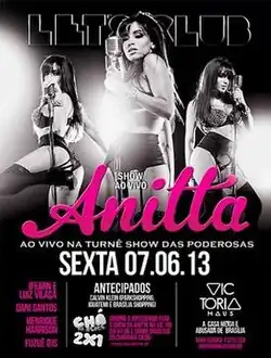 Turnê Show das Poderosas was the first concert tour of the Brazilian singer Anitta. The tour began on June 6, 2013, in Rio de Janeiro,[1] Brazil. At the premiere of the first tour was in Barra da Tijuca in Rio.[2] The tour dates happened in nightclubs and parties in Brazil.