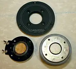 Various materials are used in the construction of compression driver diaphragms including titanium, aluminium, phenolic impregnated fabric, polyimide and PET film, each having its own characteristics. The diaphragm is glued to a voice coil former, typically made from a different material from the dome, since it must cope with heat without tearing or significant dimensional change. Polyimide film, Nomex, and glassfibre are popular for this application. The suspension may be a continuation of the diaphragm and is glued to a mounting ring, which may fit into a groove, over locating pins, or be fastened with machine screws. The diaphragm is generally shaped like an inverted dome and loads into a series of tapered channels in a central structure called a phase plug, which equalizes the path length between various areas of the diaphragm and the horn throat, preventing acoustic cancellations between different points on the diaphragm surface. The phase plug exits into a tapered tube, which forms the start of the horn itself. This slowly expanding throat within the driver is continued in the horn flare. The horn flare controls the coverage pattern, or directivity, and as an acoustic transformer, adds gain. A professional horn and compression driver combination has an output sensitivity of between 105 and 112 dB/watt/meter. This is substantially more efficient (and less thermally dangerous to a small voice coil and former) than other tweeter construction.