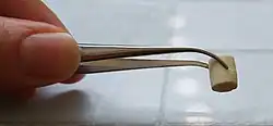 Tweezers come in a variety of tip shapes and sizes.[5] Blunt tip tweezers have a rounded end which can be used when a pointed object may get entangled, when manipulating cotton swabs, for example. Flat tip tweezers, pictured at right, have an angled tip which may be used for removing splinters. Some tweezers have a long needle-like tip which may be useful for reaching into small crevices. Triangular tip tweezers have larger, wider tips useful for gripping larger objects. Tweezers with curved tips also exist, sometimes called bent forceps. Microtweezers have an extremely small, pointed tip used for manipulating tiny electronic components and the like.