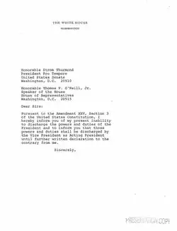On July 12, 1985, President Ronald Reagan underwent a colonoscopy and was diagnosed with bowel cancer. He elected to have the lesion removed immediately,[39] and consulted with White House counsel Fred Fielding about whether to invoke Section 3, and in particular about whether doing so would set an undesirable precedent. Fielding and White House Chief of Staff Donald Regan recommended that Reagan transfer power, and two letters were drafted: one specifically invoking Section 3, the other mentioning only that Reagan was mindful of its provisions. On July 13, Reagan signed the letter mentioning that he was mindful of Section 3[40] before being placed under general anesthesia for a colectomy,[41] and Vice President George H. W. Bush was acting president from 11:28 a.m. until 7:22 pm, when Reagan transmitted a letter declaring himself able to resume his duties.[42]