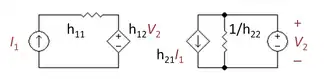 Figure 6: H-equivalent two-port showing independent variables I1 and V2; h22 is reciprocated to make a resistor