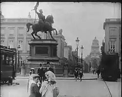 A young boy and his sister see a motor-car ready to depart in front of their house. They hook their little cart to the back of it, step in and drive along until they reach the Place Royale (English: Royal Square), with the statue of Godfrey of Bouillon in its center and the Palais de Justice (English: Law Courts of Brussels) in the background. From there, they walk on to visit the Grand-Place and watch the Manneken Pis being dressed.