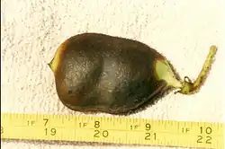Tylosema esculentum, with common names gemsbok bean and marama bean or morama bean,[2] is a long-lived perennial legume native to arid areas of southern Africa. Stems grow at least 3 metres (9.8 ft), in a prostrate or trailing form, with forked tendrils that facilitate climbing. A raceme up to 25 millimetres (1 in) long, containing many yellow-orange flowers, ultimately produces an ovate to circular pod, with large brownish-black seeds.