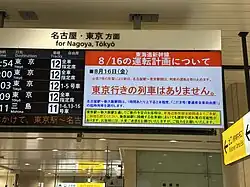 Typhoon Ampil arrived during Japan's Obon holiday week—just days after Tropical Storm Maria caused record-breaking rainfall in parts of northern Japan.[26] As the strong storm brushed the coast of Japan, hundreds of thousands in Tokyo and surrounding areas were advised to evacuate. A total of around 178,000 households, over 404,000 people, were given an evacuation order. Similar notices were issued in Yokohama. Many modes of transportation like flights and trains were cancelled on August 16 as the typhoon approached.[27] Japan Airways and All Nippon Airways cancelled around 600 flights to Haneda Airport and Narita International Airport.[28][29] East of Tokyo in the Chiba Prefecture, trees were downed and many roads were flooded. In Tokyo and in multiple bordering regions, heavy rainfall affected areas, increasing the risk of flooding and landslides. High waves warnings were issued, mainly in the Izu Islands.[30] The Tropical Cyclone Condition of Readiness (TCCOR) was raised from TCCOR 3 to TCCOR 2 for Yokosuka Naval Base on August 15, indicating that winds of 92 km/h (57 mph) or higher were possible within 24 hours.[31] A barrier obstructing Japan's Mount Fuji from a nearby convenience store was recently taken down to avoid damage.[32]