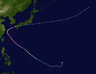 After attaining peak intensity, the storm weakened slightly on September 24 according to the JMA, though the storm briefly restrengthened to its peak wind speed at noon on September 25.[2] By this time, Forrest was moving northwest, and the JTWC expected the storm to re-curve due to a weak spot in the subtropical ridge. However, the re-curvature took longer than expected.[1] The JMA suggested that the storm maintained its intensity of 200 km/h (125 mph) for several days. On September 27, however, the JMA estimated that Forrest finally began to weaken.[2] The storm quickly weakened thereafter, and by midday, the JMA downgraded the system into a severe tropical storm. During September 28, the system completed its extratropical transition, with the JTWC issuing their final advisory on the system early on the next day.[1] After becoming an extratropical cyclone the system recurved and started to accelerate towards the east-northeast, before the JMA stopped monitoring the system during September 30, as it moved into the East Pacific basin.[1][2] Thereafter, several ships reported storm and gale force winds while the system moved towards the east-northeast as it approached southwest Alaska.[8] The system subsequently stalled and gradually dissipated over the open waters of the Gulf of Alaska, with the system being last identifiable on October 4, about 1,415 km (880 mi) northwest of Vancouver.[8]