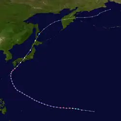 Shortly after reaching peak intensity, Nancy approached the Ryūkyū Islands and began turning. It passed near Okinawa and over Naze. The ridge steering Nancy broke down, and the typhoon turned sharply and headed towards Japan. Nancy made landfall as a strong typhoon on September 16 as it passed directly over Cape Muroto. Nancy made a second landfall on Honshū near Osaka. The typhoon rapidly traveled up the length of the island as it continued accelerating, eventually reaching a forward speed of 65 mph (105 km/h; 56 kn).[2] The typhoon quickly crossed over Hokkaidō before entering the Sea of Okhotsk as a tropical storm. Nancy went extratropical on September 17. The extratropical system eventually crossed over Kamchatka and entered the open ocean.[3]