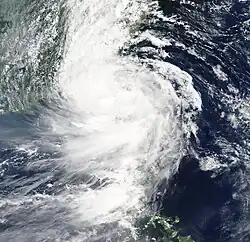 On August 30, Nanmadol slowed moving and became almost stationary. The low level circulation center became exposed and the curved convective banding moved to the south of the system.[27] Soon it started experiencing strong wind shear and continued weakening. The shear pushed convection approximately 70 knots (130 km/h; 81 mph) south of the LLCC. The system also accelerated towards China at 08 knots (15 km/h; 9.2 mph) and weakened to a minimal tropical storm.[28] After its third landfall over Fujian, China, Nanmadol weakened rapidly prompting both the JTWC and the JMA to issue their final warnings on the system.[29][30]