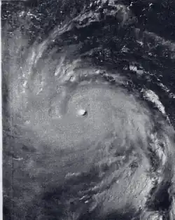 By the evening of October 5, Nora had attained winds in excess of 260 km/h (160 mph), ranking it as a Category 5-equivalent super typhoon on the Saffir–Simpson hurricane scale.[1] A recon mission into the storm at this time revealed concentric eyewalls, measured at 14 km (9 mi) and 32 km (20 mi). Initially, the aircraft was unable to penetrate into the core of the eye due to severe turbulence; however, they were successful after a second attempt. Once inside the eye, they discovered an almost cloud-free center with "an amphitheater or bowl-like appearance." Stratocumulus clouds were suppressed to an unusually low altitude of 1.2 km (0.75 mi). The core of Nora was exceptionally warm, with temperatures reaching a near-record 30 °C (86 °F) at the 700 mb level. At 0020 UTC on October 6, a dropsonde released by the reconnaissance team recorded a surface pressure of 877 mb (hPa; 25.91 inHg) just inside the eyewall of the typhoon.[4] At this time, maximum winds were estimated to have peaked at 295 km/h (185 mph).[1] This intensity ranked Nora as the most-intense tropical cyclone on record in the world, alongside Typhoon Ida in 1958. However, in post-storm analysis, it was noted that since the dropsonde did not record a pressure at the storm's center, Nora was likely slightly stronger than indicated.[4] Since then, Nora's intensity has been surpassed by 2 other storms: Typhoon Tip in 1979, and Hurricane Patricia in 2015.[5][6]