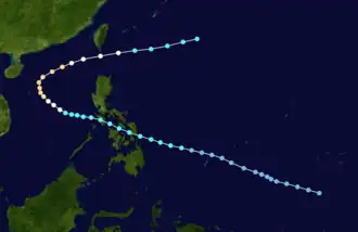 Olive would steadily intensify after it entered the South China Sea on April 20, being in an environment with good outflow aloft and warm Sea surface temperatures, resulting in it intensifying into a typhoon on 6:00 UTC on April 22. Olive would recurve due to a break in the subtropical ridge, peaking with sustained winds of 100 mph (160 km/h) the next day. Olive would accelerate to the east-northeast, steadily weakening due to intruding cool and dry air, resulting in the system becoming extratropical early on April 26.[1]