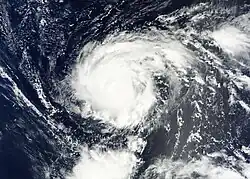 On September 26, an image from Advanced Microwave Sounding Unit (AMSU), a multi-channel microwave radiometer installed on meteorological satellites depicted that Nesat developed an eye like feature approximately 225 nautical miles (417 km; 259 mi) east-northeast of Manila, Philippines. At that time, it had a 1-min sustained wind speed of 80 knots (150 km/h; 92 mph) with deep convection primarily over the western semicircle of the system.[13] The system rapidly deepened and quickly developed a 30 nautical miles (56 km; 35 mi) ragged eye and mesoscale anticyclone aloft generating an exceptionally excellent all-around outflow. Also, the system had a highly symmetric radial outflow. The JTWC Originally anticipated Nesat to become a Category 5 super typhoon on the SSHS with winds exceeding 130 knots (240 km/h; 150 mph) (1-min sustained). However, because of a cold anomaly, the system only reached a maximum 1-min sustained wind speed of 115 knots (213 km/h; 132 mph) making it a minimum Category 4 typhoon.[14]