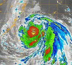 Throughout September 16, Wipha underwent a brief period of rapid intensification, with the JTWC upgrading it to a Category 1 hurricane, on the Saffir–Simpson hurricane scale, within 12 hours.[4] The intensifying system maintained a northwesterly track in response to a subtropical ridge over the northwest Pacific.[6] Early on September 17, Wipha was upgraded to a typhoon as 10-minute sustained winds reached 120 km/h (75 mph).[3] A second round of rapid intensification took place through most of the day, leading to the typhoon attaining its peak intensity late on September 17 with winds of 185 km/h (115 mph) 10-minute sustained) and a barometric pressure of 1 mbar (hPa; 27.32 inHg).[3] At the same time, the JTWC assessed Wipha to have nearly attained Category 5 status, peaking as a high-end Category 4 super typhoon with winds of 250 km/h (160 mph) 1-minute sustained).[4] Upon reaching this intensity, Wipha became the second strongest storm of the 2007 Pacific typhoon season.[3]