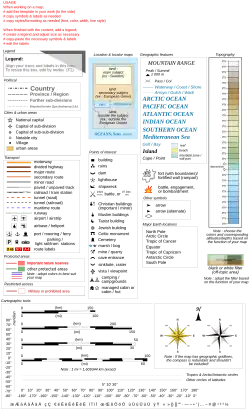 Text simultaneously serves several purposes on maps. In 1993, D. J. Fairbairn introduced a taxonomy of the purposes of text on maps, identifying fourteen types of text role.[7] Since then, others, such as cartography textbooks, have described the variety of roles of text, with the following generally being the most common: