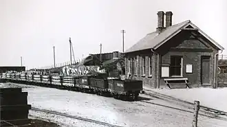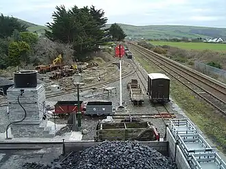 The earliest recorded passenger train from Wharf was in 1877, though there is circumstantial evidence of them even earlier than that.[2] Around 1910, the station was renamed Towyn Wharf, although the name of "King's station" continued to be used for formal occasions until at least 1915.[2] The station had no run-round loop at the time;[1] shunting was carried out by propelling trains up the gradient out of the station and allowing them to run in under gravity.[3] A siding was provided in the cutting just to the east of the station, to aid this gravity working.[3] Passenger trains were propelled to the loop at Pendre, where they were run-around.[1] It was only after the line had been preserved in 1951 that a loop was finally provided, in the winter of 1951–1952.[1]