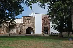 The main attraction of the modern town is the former monastery complex of San Francisco, which was founded in the 16th century.[9] The complex was designed and initiated in 1530 by Spanish architect (and Franciscan friar) Fray Pedro de Pila.[10] The complex contains the Church of San Francisco, the Church of La Soledad, two open chapels and a large atrium,[9] with much of the building material obtained from the nearby yacata pyramids that the Spanish destroyed.[11] The Church of San Francisco is the first built and still conserves the arch that separates the presbytery from the nave, which was the original portal of the 16th century. Next to this portal is a small open chapel from the same time period. There is a plaque on this open chapel that states that it stands on the site of the first Mass to be celebrated in Michoacán.[9] Inside the Church of La Soledad is the "Santo Entierro", which is a wax figure of Christ displayed in a glass coffin. It is believed (by Mexican folklore) that the arms and legs of this statue are growing. One end of the coffin has an extension added for the feet, with the toes reaching the glass end. Inside the coffin are U.S. and Mexican currency.[12][13]
