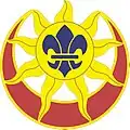 The shoulder sleeve insignia is an octofoil resembling a heraldic design given to the ninth son of a family. This represents the son as a circle in the middle with eight brothers around him.[2] The blue represents the infantry, the red the artillery, with the white completing the colors of the flag of the United States of America.