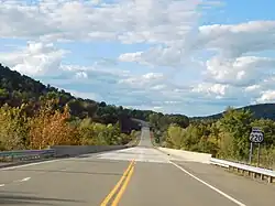 US 220 heads northeast through more rural areas before bypassing Towanda to the west. The two-lane undivided bypass has an interchange at Patterson Boulevard that provides access to the borough. The route curves west then northwest as it comes to a diamond interchange with US 6. Past this, US 220 continues north as a two-lane undivided road through a mix of farmland and woodland along the west bank of the Susquehanna River, passing through Ulster and Milan. South of Athens, the route intersects the southern terminus of PA 199 before turning into a four-lane freeway that bypasses the Penn-York Valley boroughs of Athens, Sayre, and South Waverly to the west. US 220 crosses the Chemung River and comes to a diamond interchange at West Pine Street that serves Athens. The highway continues between the river to the west and developed areas to the east before it reaches an interchange at Mile Lane Road that serves Sayre and South Waverly. The route enters South Waverly and comes to its northern terminus at an interchange with I-86/NY 17, which is maintained by the state of New York despite being in Pennsylvania. Past the northern terminus, the road crosses the New York border, intersects Broad Street, and ends a very short distance later at Chemung Street in Waverly.[1][2]