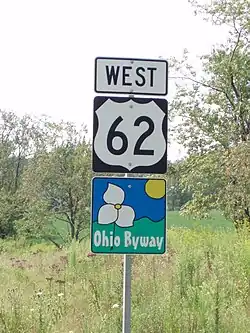 A US 62 marker in Killbuck, Ohio, in Amish Country, also marked as an Ohio Byway