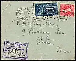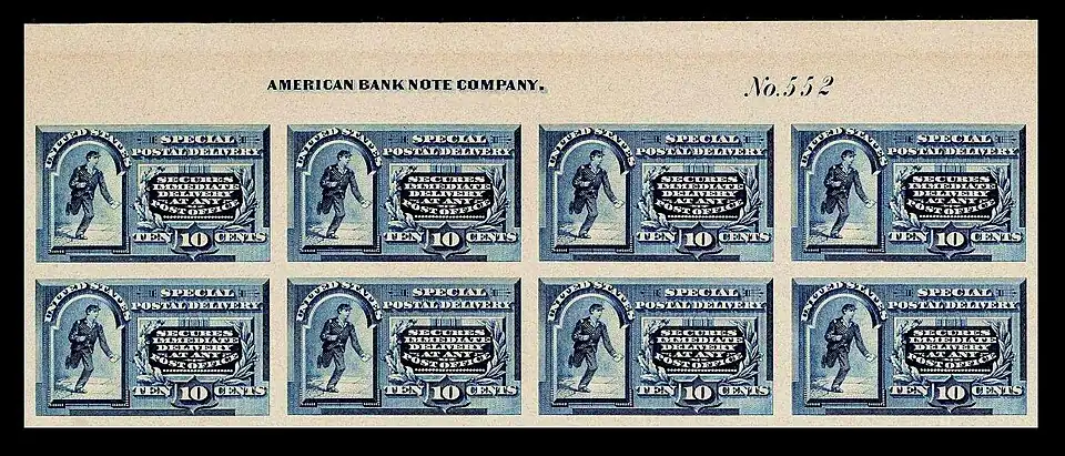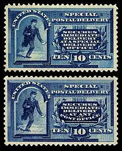 In 1885 Congress enacted the use of "a special stamp of the face valuation of ten cents ... [that] when attached to a letter, in addition to the lawful postage thereon ... shall be regarded as entitling such letter to immediate delivery."[1] The first Special delivery stamp was printed by the American Bank Note Company and issued on October 1, 1885. It could not be used to prepay postage or any other service. The stamp bears the words "Secures immediate delivery at a special delivery office,". In 1886 the Special Delivery service was expanded to all post offices and a new stamp was designed. The revised stamp was identical to the first issue of 1885 but instead bore the statement "Secures immediate delivery at any post office." The release of the revised stamp was delayed by the Post Office until 1888, however, allowing supplies of the first issue to be sold beforehand.[2] But the usage of such stamps had their drawbacks. Special Delivery only served communities whose population was over 4,000 people and could not guarantee delivery by a specific time. To be valid the Special Delivery stamp had to be affixed to the envelope along with all other postage and could not be used to prepay regular and airmail postage.[1]
