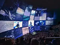 For sound mixing, engineer Joe O'Herlihy utilised two DiGiCo Quantum SD7 digital mixing consoles with redundant engines; he mixed on one console and maintained a mirrored backup to which he could automatically failover.[58] Each console was capable of 128 input channels, and of the 48 aux-sends available for each channel, O'Herlihy used 32 of them for the Holoplot speaker arrays.[19] He decided to focus the sound image of the band's performances towards the proscenium.[106] By routing separate audio of each band member to the corresponding speaker cluster above their location on stage, he achieved what he called "pictorial audio—where you see the musician, you hear the musician". The immersive speaker clusters, located midway up the auditorium, were used by O'Herlihy for keyboards, backing vocals, guitar treatments, and string or choral arrangements, and he occasionally panned them from side to side to add what he called "shimmer" to the band's sound.[19][61] O'Herlihy erred on the side of exhibiting restraint in his mix, as panning too far to the sides could have introduced time alignment issues. For certain songs, he made creative mix choices; during the guitar solo of "The Fly", as the visuals directed the audience's attention to the ceiling, he refocused the mix of the guitar to that area.[61]