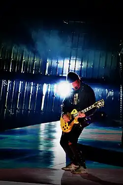 The band members wore in-ear monitors by Shure with an Axient wireless system. Sound was mixed for their monitors on three DiGiCo consoles: one for Bono, one for the Edge, and one for Clayton and van den Berg.[19] Each console for monitor mixing was also paired with a mirror one for redundancy.[58] The crew isolated the Edge's Marshall and Vox AC30 guitar amplifiers and Clayton's bass amplifiers by Ampeg, Matchless, and Fender underneath the stage.[20] Contrasting with his past equipment setups, the Edge added digital amplifier emulation pedals by Universal Audio to his guitar rig[107] and alternated between using them and his amplifiers to achieve specific guitar sounds.[20] Lillywhite said the Edge's guitar initially sounded harsh, necessitating adjustments to be made.[20]